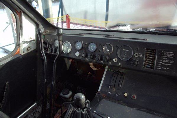 A műszerezettségnél nem volt szempont a hedonizmus és a látványvilág, a lényegi információk gyors átadása annál inkább. Ezért sem tököltek sokat azon, mi kerüljön a rücskös, függőleges fémlemezbe, amit máshol műszerfalnak hívnak. Vízhőfök, fordulatszám, olajnyomás és voltméter valamint a tank szintjelzője, régi ismerősként üdvözlöm a PAL-műszereket. Ezen kívül van egy Quartz-márkájú üzemóraszámlálónk, pár világításkapcsoló és persze a két irányváltó kar. Fék, kuplung, gáz plusz a váltókar, ennyi. Ja, el ne feledkezzem a világ legmegbízhatóbb dőlésszög-mérőjéről, amely annyira analóg, amennyire csak lehet. Tengelyirányba és keresztben is elfordítható, utóbbi nem elhanyagolható, hiszen a Lavinát nem ajánlatos 30 foknál nagyobb oldaldőlésű rézsűre vinni. Így ha valahová orral mentünk fel, akkor ajánlatos a tetején megfordulni, vagy szépen visszatolatni, mert fel tud borulni és ezen a világ összes lánctalpa sem segít.