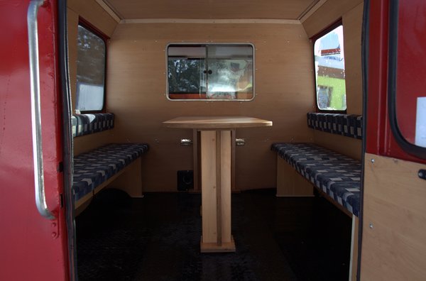Ezzel együtt Botond az egész gépet áttrélerezte Nagyorosziba, ott rakták rendbe az elektromos rendszerét és lényegében újjápítették a felépítményt, így megőrizte eredeti, dobozos formáját. Nem egy Mazda-féle Kodo, fény-árnyék átmenet is csak annyi van rajta, mint Kojak tarkóján, de a maga funkcionalitásában, csapott szélvédőjével szinte sportos és kompakt kis gép: a havas lejtők MX-5-ös Mazdája. Szegecselt lemezbódé, Škoda fényszórók és két kiegészítő fényszóró a tetőn. Nincs túltolva a giccs, nincs menő matricázás rajta, a hegyek között a feltűnő, piros színnél nincs jobb, ez is mutatja, hogy ez alapvetően megmaradt munkagépnek, nem menőzni akarnak vele. A teljes felújítás 4000 eurót dobott még rá a vételárra, cserébe képessé vált egy kisebb csoport (család, baráti társaság) komfortos szállítására olyan helyekre, ahová másképpen nem igen jutottak volna el. A Webasto kiegészítő fűtés tökéletesen kifűti a dupla paddal és asztallal ellátott utasteret és a kabint is.