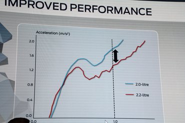 Teljesen mindegy volt, hogy a 105 lóerőst, a 130 lóerőst vagy a 170 lóerőst próbáltuk, egyesben még alapjáratról gyorsítva sem volt zavaró késlekedés, sőt, ilyenkor még a raktérben lenyűgözött teszt-terhek ellenére is igen vehemensen indultak meg. Ugyanilyen helyzetben a régi 2,2-esekkel idegesítően sok idő telt el, mire meglódult a nagy kaszni. Oké, a fordosok által vázol „kettesben csorgunk hússzal a körforgalomhoz és már ki is lövünk” helyzetet nem sikerült reprodukálni, a raktérben 600 kg terheléssel az egy másodpercen belül érezhető gyorsulás inkább olyan három másodperc alatt jelentkezett, de akárhogy is, a réginél sokkal felhasználóbarátabb az új motor.