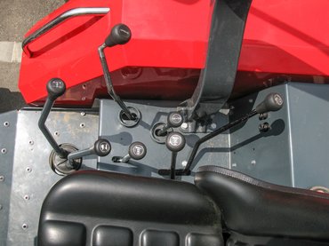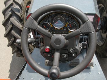 A kormány ugyanolyan, mint a többi modern traktoron: a forgatógombos volánnak nincs meghatározott középállása, úgy állnak a küllők, ahogy induláskor éppen voltak. Visszajelzés semmi, de az egyenesbe visszatérítő hajlam is ehhez áll közel – ez még a prototípus gyermekbetegsége, ha állítanak egy picit az összetartáson, bizonyára elmúlik. A betonról földes területre lekanyarodva visszaveszek a tempóból, mert billenő felfüggesztésű ugyan az első híd, de rugózás csak annyi van, amennyit a gumiabroncsok rugóznak, szóval dobál egy kicsit a traktor, és tekintettel kell lennem a gyakorlati kivitelezésében nagy szerepet játszó Sándorra, aki a sárvédőn ülve kapaszkodik mellettem.