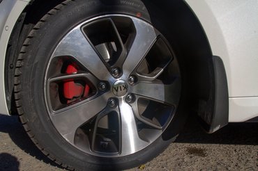 Szóval oldalról szép, elegáns az Optima GT SW, egy centit ültettek rajta a mezei változatokhoz képest. Jót tett neki, a fehér szín még mindig menő, a felnidizájn is rendben van, és végre látszik, van ott, ami kitöltse a kereket: elöl 330-as, hátul 314 milliméteres tárcsákat kapott. Egyedül a pirosra festett féknyergeket érzem erősnek, mert ugyan jól mutatnak, ha mondjuk négy- vagy nyolcdugattyús banánok ölelik körbe a tárcsákat, de ezek nem azok.