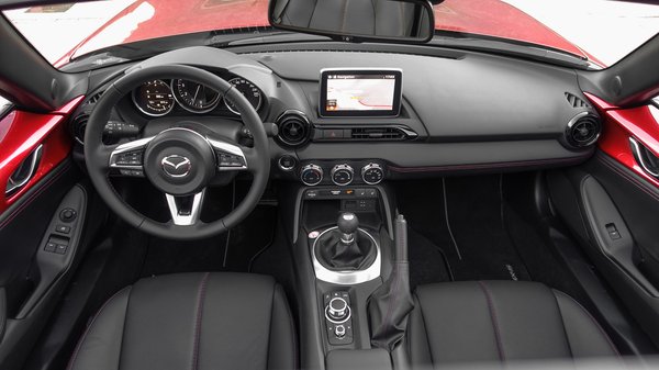 Az MX-5 hagyomány része, hogy a kézi váltó nagyon rövid utakon jár és tűpontos. Az autó orrába hosszában épített motorok mögött, közvetlenül a váltókar alatt található a szerkezet. Menet közben nemcsak a tűzfalba tolt blokk melengeti az utasteret, de kicsit a váltó is. Az utasoldalon méretes púp veszi el a lábtér háromtenyérnyi részét, ezért ott tényleg csak nyújtott lábbal illik ücsörögni.