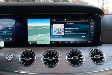 Az utastér is az alap E-osztály öröksége, de a kupévá alakítás során sokat finomítottak rajta. A műszerfal hullámos fabetétje elegánsan fordul rá a nagy ajtókra, a hosszú felületet kör alakú, turbinákat idéző szellőzőrostélyok szakítják meg. A modern Mercedesek dupla iPadre hajazó, egybefüggő műszeregysége gyönyörűen illik a designba. Elsőre talán kicsi sok a díszítés, de a jó ízléssel összeválogatott színek, formák és anyagok egyedi hangulatához hamar hozzászokik az ember.