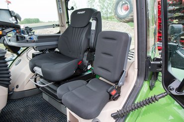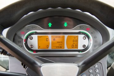 A fülkéje tágas, saját mini hűtője van, digitális klíma, víz- és légszűrő tisztítja a levegőt az utastérben, és a 10,4 colos LCD kijelzőn térkép-applikáció fut, de innen változtatható akár a traktor kerekeinek nyomása is.