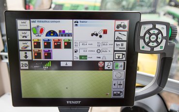 Egy 12 méteres munkaeszközzel a hátunk mögött indultunk tárcsázni. Nyomtunk egy kövér gázt, és még két gombot, a traktor elindult, a tárcsázó pedig a földbe süllyedt, nagyszerű látvány. Minden egyszerűen működik az utastérben, azon túl is, hogy az automata kormányt nem kell fogni, oldalt a kijelzőn meg úgyis látsz mindent. Ameddig nem kell fordulni a parcella végén, addig jobb, ha arra figyelsz, hogy ne nyúlj a kormányba, nehogy véletlenül kikapcsold az automatikát. Amikor viszont a sor végére értünk, már bele kell nyúlni a forduláshoz.