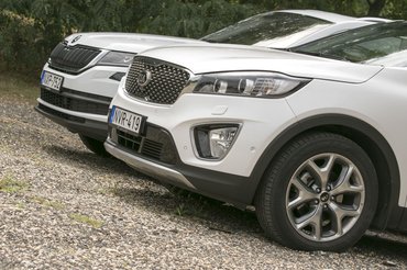 Menetdinamikában nem érezni érdemi különbséget a két autó között, méreteik ellenére mind a kettő bőven többet tud a forgalom átlagánál. A Škoda ugyan 10 lóerővel és 40 newtonméterrel gyengébb, de majdnem száz kilóval könnyebb, és a váltó sűrűbb fokozatkiosztása miatt is jobb a gyorsulása több mint fél másodperccel. Érdekes a futómű is: a hosszabb szintkülönbségeket szépen kimozogja, empatikusan bólogat a nagy test, viszont a kisebb úthibákon meg ráz. A tesztautóban amúgy állítható volt ez is, többnyire komfort módban használtam. Ezzel együtt is a kisebb, de keményebb ütéseket a Kia valamivel jobban felvette, de ebben egyik nem-prémium SUV sem remekel. Egy óvatos terepezésre is rápróbáltunk, de mind a két autó annyira volt való a homokbuckákra, mint Danny DeVito a Feláldozhatókba: mókásan mozogtak, de komolyan venni egyiket sem lehetett. Az viszont tiszteletreméltó, hogy még utcai gumikkal is meghökkentően magasra jutottak a siratófalon, megállni csak azért kellett, mert a végére túl szűk volt már az ösvény.