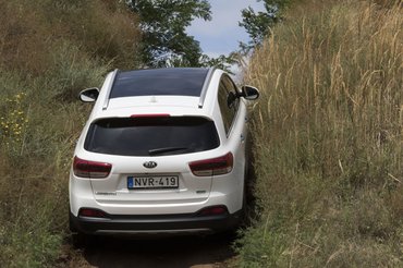 Terepezni nyilván nagyon kevesen fognak a Sorentóval, hiszen ki akarná zergehágta földutakon kínozni a tízmilliós technikát. A 16,6 fokos első és 20,7 fokos hátsó terepszöggel, valamint 18,5 centis hasmagassággal komolyabb akadályok leküzdésére alkalmatlan is lenne, de ha már hobbiterepjáró, azért egy könnyed mókázás erejéig lekanyarodtunk az aszfaltról. Az automatikus (de gombbal is zárható) összkerékhajtást nem igazán tette próbára a laza homok, pedig először az elakadástól tartva csak óvatosan mertem nekiindulni. Ezeket a nem túl extrém huplikat a futómű zajok és zörejek nélkül röhögve kirugózza. Meglepetést a fordulékonyságával okozott a Sorento, arra számítottam, hogy a homokos talajon orrtolósabb lesz.