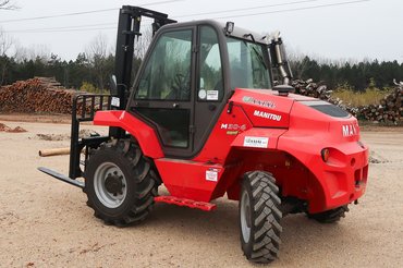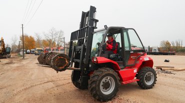 A műfajhoz korábban is volt szerencsém, nagy kertészetben próbáltam ki egy Manitou M30-2-est, amelyet például fél-kéttonnás Big-Bag műtrágyás zsákok cipelésére használnak. Furcsa érzés volt a facsemete-sorok közötti földúton krosszozni. A típus egyetlen hátránya, hogy csak két kereke hajt (ezek persze a nagyobb méretű elsők), ezért előfordulhat, hogy laza vagy süllyedős talajon hiába fordítja el teljesen a kormányt az ember, csak magával húzza a gép a szinte merőlegesen keresztben álló hátsó kerekeket, és nem oda megy, ahová kéne. Legutóbb viszont a 4x4-es változatot próbálhattam ki a Kozák-Transnál, ahol telepi anyagmozgatásra használják, illetve építkezéseken pakolják le vele a raklapos téglát és egyebet beszállító kamionokat. Ennek már M30-4 a típusjelzése – mint kiolvashatjuk belőle, harminc mázsát emelhet, és mind a négy kereke hajtott.