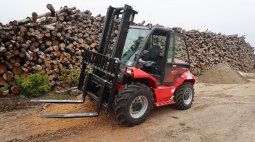 A gépet nagy, murvás kamionparkolóban kapom meg, de rögtön lecsörtetek a földútra. Ott már dülöngél egy kissé, de a 12 százalékos dőléshatárt nem érjük el. Jó ülésének köszönhetően komfortosan érzem magam. Célba veszek a hosszan elnyúló farakás mellett egy jókora fatörzs-darabot. Villát leengedni, oszlopot előredönteni, lassan előrenyomulni, hogy villavégre kapjam. Közben feltűnik, mennyire érzékenyen és finoman reagál a gép a karokkal adott parancsokra, mintha puszta kézzel dolgoznék. Hátradöntöm az oszlopot, a rönk begurul a villák tövébe, lehet megemelni és odébbvinni. Az emelési magasság maximuma 3,7 méter, fölfelé is nagyon jól látok az ülésből, bár a leeső tárgyaktól védő rács korlátoz egy kissé.