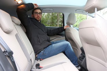 Az ülésen a deréktámaszon és a combtámasz magasságán kívül mindent kézzel lehet állítani, de legalább teljesen jól be lehet lőni a vezető alkatához mindent. Még a kartámaszt is lehet előre-hátra tologatni, így viszont tároló benne nincs, csak előtte. Az első ülés hosszabb távon sem kényelmetlen, igaz nem is ebben fogjuk átélni a legkényeztetőbb száz kilométereket. Hátul, a magamra (181 centi) állított vezetőülés mögött bőséges a lábtér, az üvegtető miatt viszont fejben kicsit passzentos. Ide is jutott egyébként ülésfűtés és USB-aljzat. A világos kárpit talán nem a legszerencsésebb választás, koszolódós lesz, az tuti, de a hangulaton kicsit javít.