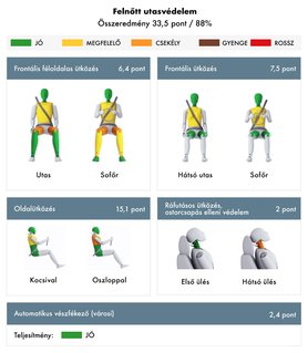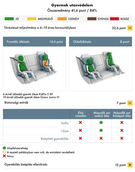 Frontális ütközésnél viszont kicsit kisebb volt a siker. A hatéves gyerek mellkasát a szenzorok alapján nagy húzóerő éri, ami sérülést okozhat. Szintén a húzóerő jelent gondot a tízéves gyerek nyakánál is, ami ugyan nem olyan intenzív, de mégis csak megfelelő besorolást kapott. A kategóriájában kiemelkedő 84%-os gyermekvédelemmel büszkélkedhet, de az összesített ranglistán csak a tizedik helyezett. A gyerekülések rögzítése egyértelmű és egyszerű. Isofix-csatlakozók a megszokott módon az autó két hátsó-szélső ülésén elérhetők, azonban övvel bármelyik ülésbe rögzíthető szinte bármelyik gyerekülés.