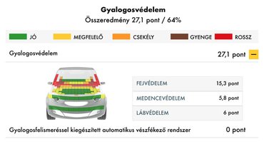 A legtöbb autó a kemény A oszlopoknál vérzik el a gyalogosvédelem tesztjein, ami az i30 esetében is így van. Ezeken kívül még a motortérfedél és a szélvédő találkozásánál van egy keményebb sáv, ahova nem jó esni, de az orr többi része próbál óvatosan bánni a gyalogosokkal. A láb és a medencecsont védelme is jó, ilyen téren nem okoz komoly károkat a Hyundai. Egy ekkora autónál arra van a legnagyobb esély, hogy a gyalogos feje a szélvédőn landol balesetnél, a szélvédő azonban megfelelően puha ahhoz, hogy ne okozhasson komoly fejsérülést. Az autó gyalogos védelme viszont nem veszi fel az erőteljes versenyt az eddigi 2017-es modellekkel. A maga 27,1 pontja és 64%-a, egy alsó-közép mezőnybe sorolja a koreai hatchbacket.