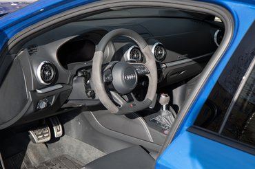Persze én élveztem a legjobban az egészet, mert én fogtam a kormányt - ami telidobálta az ujjaimat mindenféle kis mocorgó visszajelzésekkel úgy, ahogy csakis a kékvérű autók tudják – nyomkodtam a gázt, féket, rángattam a bazi gyors DSG füleit. De azért, akadt egy kis csalódás. Mert amit például egy összkerekes Alfa Giulia olyan jó csinál – hogy a kanyar végén, amikor ráállunk a gázra, áttolja a hajtást a hátsó kerekekre, hogy erősen betámasztva, hátul kissé radírozva, orral az egyenes felé jöjjünk ki a fordulóból -, azt az RS3 úgy kezeli kicsit, mint egy vidéki kultúrházas haknit. A sportautó-izomkötegek alól ilyenkor pillanatra kivillan az edzetlen, elsőkerékhajtásos alapkonstrukció, mert hajtásáthelyezés helyett az RS3-ban inkább a gyávák fegyvere, az ESP avatkozik be. Ha meg kilövöm a funkciót, akkor az orra megy kifelé. Naja, ilyenkor érezni, hogy nem jött össze az 50/50%, s hogy a jó nyomatékvektorozás is inkább a drágább autók műfaja...