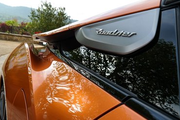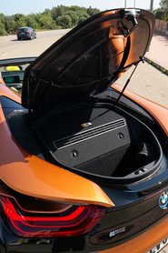 Azt is megindokolták, miért nem nyitható keménytetőt kapott a Roadster, hanem vásznat. Egyrészt hogy látszódjon a különbség a kupéhoz képest, másrészt az több helyet vett volna el, és az i8-ba így sem fér több cucc, mint amennyit az ember büntetlenül felvihet kézipoggyászként egy Wizzair-gépre. Hátul, a benzinmotor mögött van egy kis csomagtartócska, ide egy kis bőröndke fér, meg van egy polc az ülések mögött, és ennyi. Az i8 orrában az elektromos hajtás van, felnyitni is csak szerszámmal lehet, az ablakmosót meg egy kis műanyag fedél kipattintásával lehet betölteni, közvetlenül az ablaktörlők mellett.