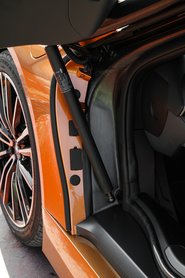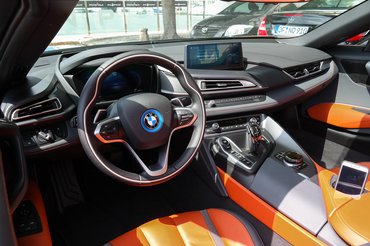 Állítólag 55 kilométert tud elmenni tisztán elektromos hajtással, de valahogy ez érdekli legkevésbé az embereket, mert mintha jelenést látnának, nem hisznek a szemüknek. Az i8 még most is egy olyan forma, amit nem fog fel az emberi agy – mármint hogy ez szériában gyártott, megvehető autó. Ezen keveset változtat a tény, hogy nyitható a teteje. Azt viszont jobb, ha nem látja a közönség, hogyan mászik be az ember, mert a szélvédő nagyon az utastér fölé nyúlik, szóval kicsit tornázni kell, hogy beküzdjük magunkat a szárnyas ajtó alá, és ezek a mozdulatok nem igazán méltóságteljesek.
