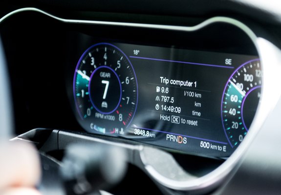 A hat helyett, ami a 2015-ös tesztautóban volt, most már tíz fokozatú az automata váltó. Tök jó. A Mustang ennek köszönhetően is tud elnémulni valahol 70-80 km/h között, már amennyiben nem maceráljuk a gázpedált. Olyan alacsony fordulatszámokkal autózhatunk, mint az 1500 RPM 90 km/h-nál, de képes már városban, 50-nél is felkapcsolni 7-esbe vagy 8-asba, és akkor 1200-1300-as fordulat körül gurulgatunk. 130-nál 10-esben alig éri el a kétezret. Ezért is tud olyan viccesen keveset is fogyasztani. Városban ugye folyamatosan nyomjuk a közszolgálati demó üzemmódot, tehát már a 16 liter is a jobbak közé tartozik, de inkább 20 a reális. Országúton viszont elkezd egyre lejjebb menni, jómagam például egy Magas-Tátrát átszelő Budapest-Krakkó-Budapest viszonylatot 9,5 literes átlaggal jártam meg.