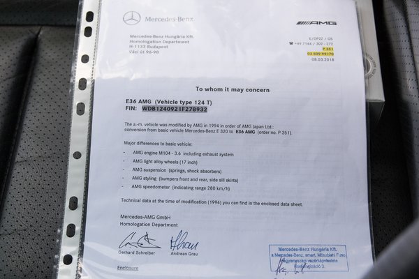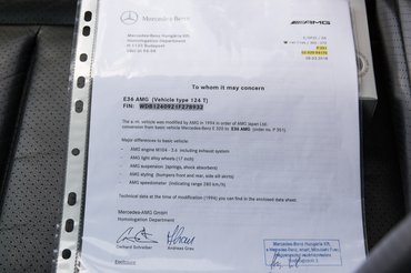 Nagyjából az is. Ennek az autónak a születésénél épp egy csibeszökkenéssel vagyunk csak az előtt, hogy az AMG rendes, Mercedes-szalonban, Mercedes-garanciával ellátott autókat kezdjen gyártani – az volt ugye, a C36 AMG 1996-ban, csak hogy felfrissítsük az emlékezetet. Ez a kocsi itt 1994-es, tehát ezt valaki még Mercedes-Benzként vette a kereskedésben, huszonnégy évvel ezelőtt, aztán elvitte Affalterbachba, Aufrecht és Melcher urakhoz, hogy azok AMG-t faragjanak belőle. Mert akkor ez még így ment, nem létezett bolti Éijjemdzsíj.