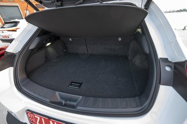 Amúgy nem nagy autó ez, nincs egészen 4,5 méter hosszú, csomagtartó tehát olyan bőséggel nincs benne, de ami van, nem használhatatlan, bár szerintem jobb lett volna, ha nem a rejtett üreg olyan bazi nagy a padló alatt, inkább lejjebb teszik a szintet. Aha, akkor meg magas lett volna a rakodóperem... Tetszett volna máshogy nekikezdeni. Legalább van szép kárpit, némi rögzítési lehetőség, voltból tizenkettő, lámpa. Ezen a szinten ez a minimum – a csomagtérajtó pedig motorosan nyílik-csukódik.