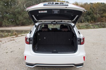 Fejtér van elég, nagyon prémium a klímapanel is, ami hátra jutott, csak piszok nyomasztó a csomagtartóban ülünk-érzés. Ezen csak ront, hogy ami még kívülről nagy íves ablaknak tűnik, valójában csak egy kis lőrés, ez adja a természetes fény nagy részét annak, akit ide száműznek. És akkor ott van még a csomagtér, ami már rögtön pár liter mínuszban indít, hála annak, hogy villanymotorok állítják és döntik a két ülést. Nagy kényelem, hogy nem kell bemászni döntögetni, de nem kevés litert áldoztak be a motoroknak.