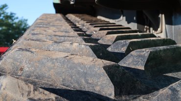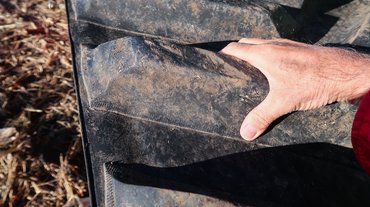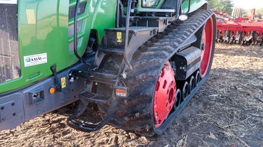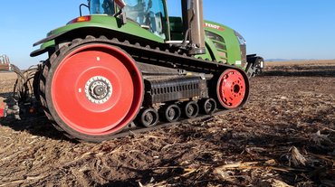 Gumihevederből egyébként többféle szélesség választható, a kipróbált traktoré 30 colos, azaz 762 milliméteres extrém mezőgazdasági volt. A három méteres tengelytávval körülbelül négy négyzetméteres felfekvő felület adódik, tehát nagyjából fél kiló esik egy négyzetcentiméterre. Megvizsgálva a nyomokat a kukoricatarlón úgy láttam, hogy nem esett különösebb kár az ott heverő kukoricaszárakban, maga a gumiheveder egyáltalán nem süllyedt be, csak a kapaszkodó profilbütykei, de azok sem mélyen.