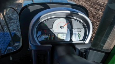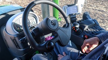 Előrenyúló, kényelmes lépcsősoron lehet felsétálni a fülkébe. Három pedál van ugyan, de közülük a kuplung csak araszoláshoz kell, például egy munkagép felkapcsolásakor. Fékre pedig semmi szükség a sík táblán, tehát lábaimnak nem lesz munkája. Lánctalpas gépeken megszokott két irányító kar helyett egy meglepően kis kormánykerék fogad, amely persze nincs mechanikus kapcsolatban semmivel: az elektronikának jelzi, hogy merre mennék. Azt is csak vonuláskor, illetve a táblavégi fordulókban, mert tárcsázás közben precíziós GPS-rendszer irányít, néhány centiméteres pontossággal.