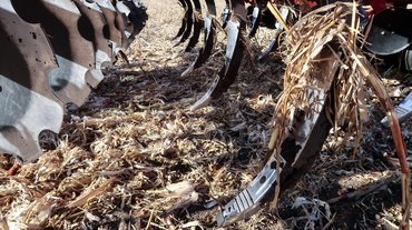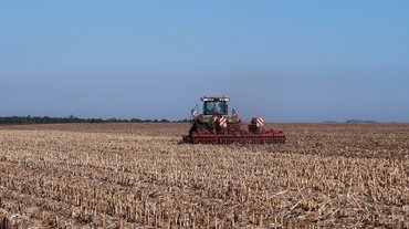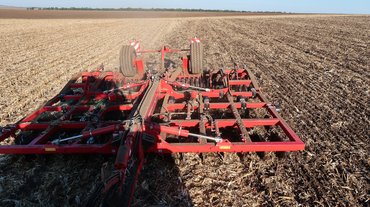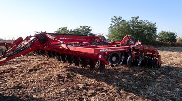 Itt van például ez a 110 hektáros kukoricatarló, amelyen ismerkedem a géppel. Akkora, hogy egyik végéről nem is látszik a másik. Jó volna két nap alatt végezni a szármaradványok betárcsázásával, a talaj fellazításával. A célnak megfelelő Horsch Tiger 6 MT nehéztárcsa nem akármilyen szerkezet: kapái harminc centi mélyen hasogatják a közepesen kötött, kissé agyagos humuszt, egyetlen ilyen elegendő lenne arra, hogy mozgásképtelenül lehorgonyozzon egy terepjárót.