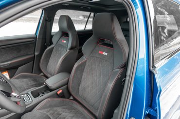 Az RS üléseinek van rendes oldaltartása és amikor sport módba kapcsoljuk az adaptív futóműre, a kormányzásra és a gázreakciókra is ható Driving Mode Selectet a menüben, a közel 1,9 tonnás óriás-Skoda meglepően összeszedetté válik. Nem billeg a karosszéria a hirtelen irányváltásoknál és csak akkor bólint előre egy kicsit, amikor rendesen letapossuk a féket.
