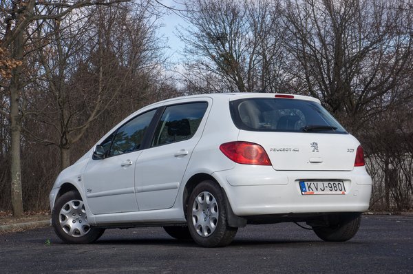 A 307-es mindig is tetszett, de nem találkoztam még olyannal, aki lerondázta volna. Hiába vettek belőle rengeteget még itthon is, ma sem unalmas a forma, egyedül ez a fehér áll kevésbé jól neki (minden más árnyalatban viszont állat). Az autót körbejárva feltűnik a beázó, bemattuló első fényszóró, mint típushiba, találni már rozsdafoltokat az ajtók alján és sarkain, az egyik hátsó sárvédőívnél, valamint látszik, hogy a csomagtér szőnyege alatti lemez lesz a következő áldozat.