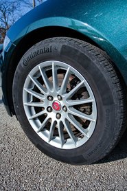 A kocsi orrán volt a másik hiba is, a párásodó bal első fényszóró, de ezeken túl csak kisebb karcokat találtam. Szinte mondanám, hogy meglepetésként a felnik is épek, de ha ránézünk a ballonos gumikra, meg is értjük ezt. Még egy tankcsapdán se lehetett volna megjárdázni a felniket ilyen duci, magas oldalfalú gumikkal. Praktikusak ezek szerint a 17 colos kerekek a 235/55 R17 gumikkal, de szebben állna rajta a 18, vagy 19 colos felni. Egyébként a Conti PremiumContact gumik még jó állapotúak voltak: ez is számít a használtautó-vásárláskor.