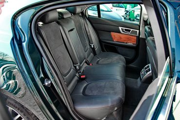 Hátra beülve hasonló a helyzet, ott viszont nem tetszik ez a szitu, mivel magam mögött (172 cm magasság) éppen befért a térdem, ebben a kategóriában azért ez szűk hátsó helynek számít. A fejem fölött is csak hét centi maradt, ez nem egy sofőrös autó, családos is csak addig, amíg a gyerekek nem nőnek fel. Középen ülni büntetés lehet, a múltkori Opel Insignia hátsó ülése jutott az eszembe, de ott legalább volt a könyöklő mögött síalagút, itt arra nem költöttek. Némi vigasz helyette, hogy hátravezették a szellőzést középen is, és a rostélyok kis állítógombjain ott a Jaguar felirat.