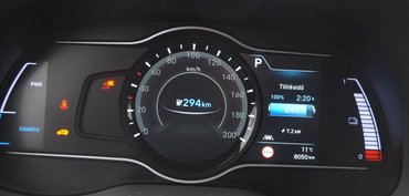 Azonban a Kona műszerfala sem tökéletes, itt is sokat spóroltak. Bár a digitális kilométeróra változik attól függően, hogy Eco, Comfort vagy Sport módban vagyunk (ezeket a menüből tudjuk kalibrálni), de a valódi LCD kijelző túl kicsi, így itt is lapozgatni kell, és aprók az adatok. A Leaf műszerfala sokkal könnyebben leolvasható, ott lényegesen nagyobbak a számok.