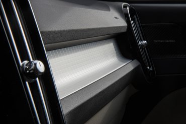 A prémium márkáknak szerintem külön részlege van arra, hogy egy drága anyagokból épített autóban is érezzük, hogy ez még nem a modelpaletta teteje, hiába fizettünk prémium-felárat. A Volvóban is vannak indokolatlan méretű műanyagfelületek, nincs tekerőpotméteres indítás, ha az ember ült már nagyobb modern Volvóban, akkor érzi, hogy messze van a csúcstól. Az ajtóbetét-kárpit viszont tetszik, ez igazából egy sima, rosszabb minőségű szövet, de váratlan helyen alkalmazva, és egész jó hozzáérni vezetés közben.