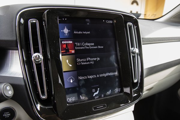 Az XC40 ilyen szempontból remek mozgó anyaméh, kényelmes ülésben ülünk, puha anyagokat fogunk, a pulzus egyedül a középső kijelző miatt fog megemelkedni. Ez az egyen-Volvo infotainment, azaz a középre beállított, hatalmas, Android-alapú tablet. El tudom képzelni, hogy az ölembe véve kiadja, de vezetés közben ezen dolgokat csinálni inkább veszélyes. Igen, ismer az ipar ennél rosszabbat, de attól ez még nem jó.