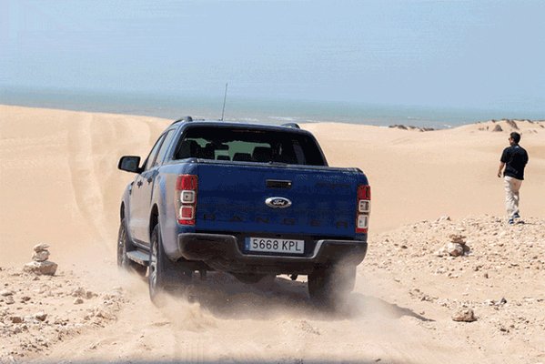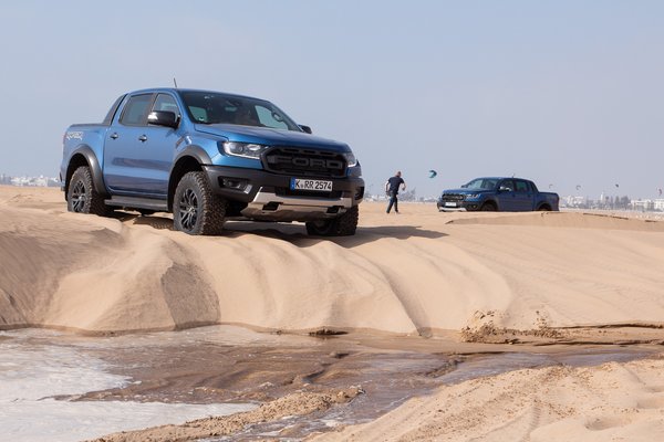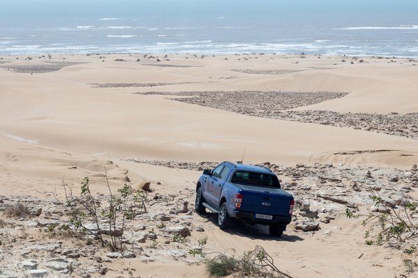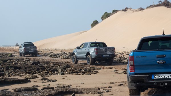 Bár Szaharából is jut az országnak valamennyi, nem ott, hanem az óceán és a hegyvidék közé szorult dűnesoron alakították ki a sivatagi tesztkört. Itt lesz igazán értelme a raptorságnak. A 32,5 fokos első terepszögnek, a 24 fokos rámpaszögnek, a mélyen barázdált gumiknak. Lassú dűnemászással szoktatják a szervezők a társaságot a homokhoz. Egy szabály van, amit be kell tartani, de azt homoklapátolás közben termelt verejtékkel írták: emelkedőn sose vedd el. És igazából így, hogy konvojban megyünk, van még egy: lejtőn sose állj meg, vagy a nyakadba kapod azt, akinek egy meredekebb dűne holtpontjánál még a horizont is a holtterében van.