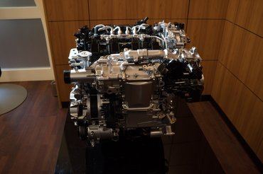 És hát finoman szólva a Skyactive-X szorul némi magyarázatra. Hiszen benzint tankolsz bele, de dízelüzemű. He? Hát kompressziós égés van benne, nem gyújtógyertya indítja be a az égést, hanem az összenyomás. Ja, akkor nincs is benne gyertya? De, gyertya speciel van, de izé, nem úgy. A különlegesen szegény keverék detonációs égését (kopogás) kontrollálandó képez egy hogyisgíjjákot, lángfrontot, vagy mit, mint egy cseresznye a muffin tetején.Ha a Mazda gyára nem ott lenne, ahol (Hiroshima), akár atomfelhővel is szemléltethették volna az elvet.