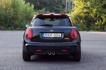 A tesztautóra valaki okosan nem konfigurálta rá a krómot, amivel általában meg szokták fojtani a fényszórókat és a hűtőrácsot. Na meg széttagolni az eleve kacifántos orrot. Itt színre fújt ívek vannak és sokkal letisztultabb így a képe. Még a John Cooper Works fantázianevű csíkokkal is a motorháztetőn, amik amúgy még egy JCW-n sem alapárasak. 50 ezer forintos extra, hogy ezt a két fekete-piros matricát felnyalják az orra, a Rebel Green fényezés pedig - amitől kevés fényben inkább fekete - 282 ezer forint. Ezt itt most csak azért írom, hogy majd ne legyen meglepetés a tesztautó ára, mert ilyen könnyű pillanatok alatt messze kerülni a háromajtós 8,8 milliós alapárától (a kabrió JCW 10,1-től indul). Az egész karaktert ügyesen felturbózó vörös tető és a vörös visszapillantó amúgy nem feláras.