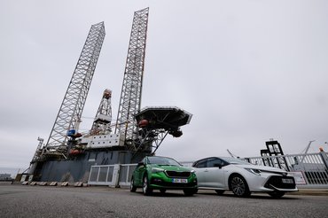 Frederikshavnben kicsit földbe gyökerezett a lábunk, mert egy ilyen fúrótornyot látni kell élőben, hogy az ember megértse, mitől betonozódik pár pillanatra az ember tüdejébe a levegő, amikor meglátja. Ezek iszonyatosan nagyok, és ha ez nem látszik a képeken, csak azért van, mert rettenetesen nagy, majdnem halszem látószögű optika volt fent a Fujin. Ekkor a Toyotában 4,8-at, a Skodában 4,7-et mutatott a fogyasztásmérő. Az út nehezebbik részén voltunk túl, akadt benne dombvonulat (hegyek ebben az országban nincsenek), 130-as autópályás veretés, közlekedési lámpák, még dugóban állás is.