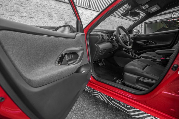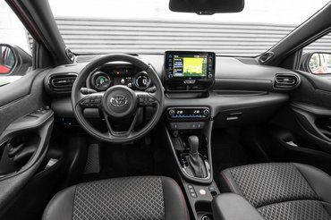 Az biztos, hogy az idősek kevésbé fogják szeretni, mert mélyebbre kell huppanni bele – ezt az ember azonnal észreveszi, amikor beül. A belső tér elég jópofa, az ajtókon filcborítás a díszítés, a műszeregység két csöve nem egy klasszikus szépség, mondjuk, de elég egyedi és némi megszokás után jól értelmezhető rajta minden, a szélvédőre pedig kifejezetten sok tartalmat, nagy felületen vetít a Yaris. Kár, hogy polarizált napszemüvegben nem látszik, pedig mi a francra vesz az ember polárszemüveget, ha nem vezetni? Ezt a Focusnál, a 3-as és CX–30-as Mazdánál már megoldották, csak szólok.