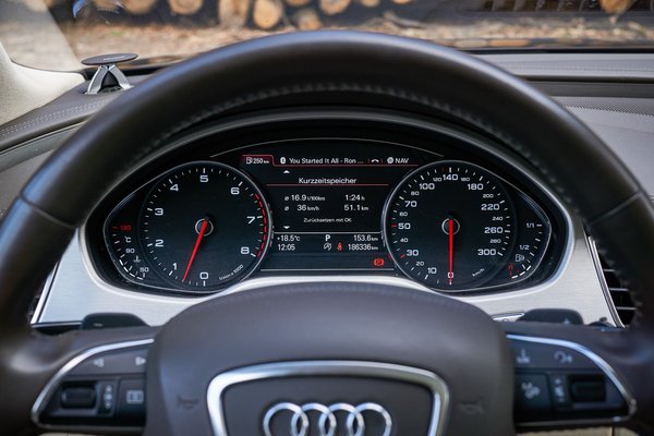 Az ülés kényelmes, ami nem hangzik komoly kijelentésnek egy sok tízmilliós luxusautóról, csakhogy vénségemre háklis lettem erre, és itt tényleg jó a vezető trónja. Minden irányban állítható, emiatt persze hetekig eltart, mire egy tulajdonos megtalálja a tökéletes helyzetet, de ez nem baj, mert akkor is kényelmes, amikor még nem perfekt. Az alacsonyabb rangú német szedánok ülései csak akkor jók, ha már tökéletesre állítottam őket, úgyhogy a klubfotel méret lesz a megoldás. A könyöklő vezetőnek és utasnak külön személyre szabható, a váltókar pedig vízszintes és bőrözött, hogy pihentethessük rajta a kezünk, amíg a mai szemmel elavultnak tűnő, de gond nélkül használható MMI fedélzeti rendszer tekerőjével és gombjaival babrálunk. Apropó bőr: feltűnően jó minőségű a kárpit mindenhol. Hiába világos az utastér, teljesen újszerű száznyolcvanezer kilométer után is.
