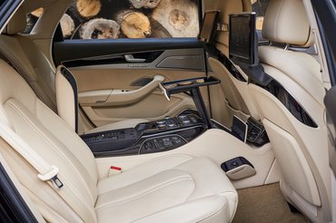 Persze egy hosszú A8-ban az igazi királykodás nem elöl folyik, a jobb hátsó ülés a főhely. Innen gombnyomásra előre hajtható az anyósülés, amelynek hátából kárpitozott lábtartó hajlik le. Így csak háromszemélyes az A8, viszont kinyújtott lábbal pihenhet a VIP. Bár a legritkább extra, a pezsgőhűtő ebből a kocsiból hiányzik, már így is elképesztő a felszereltség. Bal hátul például egy bőrözött fiókban 230V-os csatlakozó várja a titkár laptopját, jobb oldalon szivargyújtó van ugyanott, kettejük között pedig klíma- és hifivezérlő panelt helyeztek el, amihez saját kijelző tartozik az első ülések háttámláján. Megvilágított piperetükör jár minden utasnak, a kihajtható asztalka pedig olyan minőségű, amilyet nálunk pórnépeknél otthon sem találni, nemhogy kocsiban.