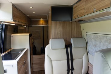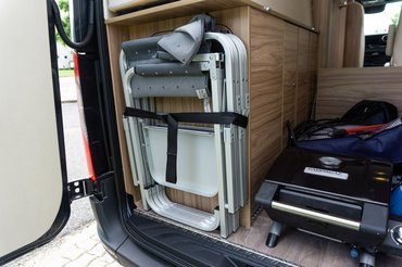 A beltér elrendezése számomra az egyik legkedveltebb, abból a szempontból, hogy a hűtő nem volt beépítve, hanem a tetejére lehetett pakolni. Persze jelen esetben csak álló helyzetben, de így is nagyon hasznos tud lenni, mert amúgy minden sík felületet elfoglal valami (főzőlap, mosogató). Ezen ugyan megpróbál segíteni egy felpattintható polcocska a főzőlap oldalán, de pakoló felületből sosincs túl sok. Ha az autó az enyém lenne, persze megcsinálnám a hűtő tetejét olyanra, hogy mondjuk az általam rendszeresen odarakott 5 literes vizes kannát menet közben se kelljen leszedni.
