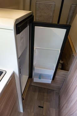 A hűtő nem az abszorpciós, hanem a kompresszoros fajtából való, 12 volt legyen, aztán elzümmög magának. Ennek előnye, hogy a nagy melegben is rendes hűtés van ahol a hármas (12V, 230V, gáz) üzemű rendszerek azért gyakran elvéreznek. Egyáltalán nem volt zavaró a kompresszor morgása éjjelente.