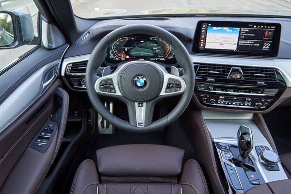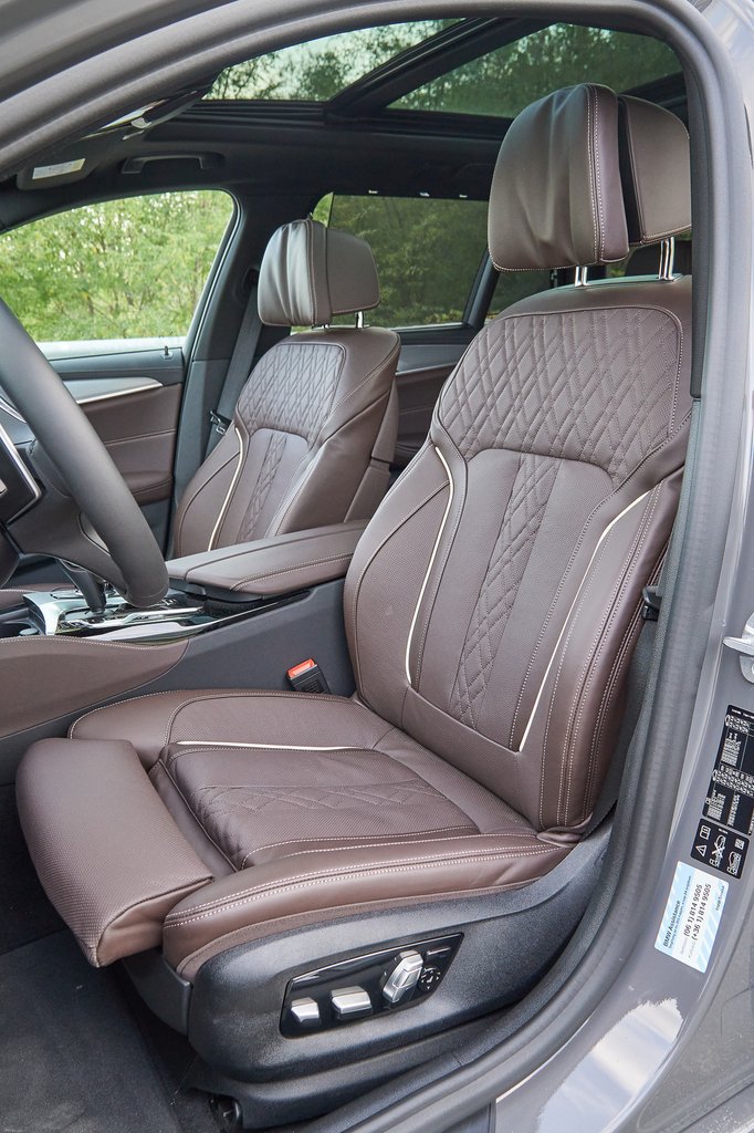 Ehhez képest nem érződik akkorának a vezető tere, pedig nagy az, csak hatalmas benne a fotel is. Bár M csomagos a tesztautó, kagylók helyett komfortüléssel kényeztet, és amikor végre megvan az ideális pozíció, onnantól fenomenális. Elképesztően finom a Nappa bőrkárpit, nem szoktam ezen lovagolni, de ez most valahogy nagyon betalált, puhának, szinte süppedősnek érződik tőle a szék, ráadásul a barnát szeretem. A többi felhasznált anyag hozza a szintet, kellemes a vezető környezete, a kapcsolók, gombok és kijelzők pedig ismerősek, annyi BMW-ben látni őket, amit meg sajátja az ötösnek, mint például az érintőképernyős klíma panel, azon nem változtatott a frissítés. Meg azon se, hogy más márkákkal szemben itt mehet együtt az ülés-szellőztetés és az ülésfűtés, ha fújni akarjuk a meleget a hátunkra.