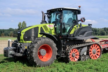 A Terra Trac gumihevederes járószerkezetről annyit kell tudni, hogy a német márka húsz éve alkalmazza kombájnjain, nagyon jó eredményekkel, de traktorhoz megtoldotta rugózással, hogy finomabban szaladjon országúti vonuláskor, illetve szép simán menjen a szántóföldön. Ez azért fontos, mert egyre extrémebb időjárásunk mind rövidebb ablakokat nyit egyes mezőgazdasági műveletek elvégzésére, és ilyenkor napokon keresztül látástól vakulásig dolgozhat a fülkében a gépkezelő, akinek jó testi-lelki állapotától nagymértékben függ a munka minősége és a termény mennyisége. Tehát gépünk lényegében egy alapkivitelben gumikerekű Claas 960-as nagytraktor, hátul gumihevederekkel.