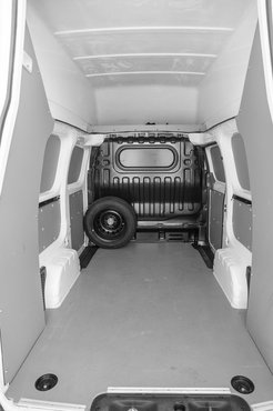 Amilyen rémisztően háztájinak tűnik kívülről, olyan profi benyomást tesz a raktér belseje. Nagyon jó minőségű az új padlóburkolat, került bele erős rögzítő szem is, ám az igazi húha az oldalfal. Általában kopasz lemezzel szoktuk tesztre kapni a furgonokat, itt viszont már kész a burkolás, sőt a rögzítést C sín segíti mindkét oldalt. Ez az a megoldás, amiben több ponton rögzíthető akár több szem, tehát aki le akarja kötni a rakományt, az le fogja tudni. Érdekes megoldás, hogy a pótkerék a vezető mögé kerül a falra, talán a fülke tetején kialakított polcon kevésbé lenne útban, de tény, hogy a hat légköbméteres változatban ott nincs megfelelő tér. A töltőkábelek bezzeg milyen jól felhajíthatók oda, és le van a gond velük.