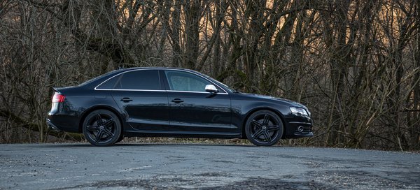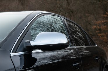 Imádom benne, hogy mekkora sleeper az egész, hiszen ez itt nem az RS 4 Avant, tehát nincs rajta DTM stílusban szögletesre rajzolt szélesítés és hatalmas, ovális kipufogóvégek meg a hörgő V8-as. Az S4 első pillantásra pontosan úgy néz ki, mint bármelyik másik fekete A4-es Audi, ezért rendesen keresni kell rajta a baljós részleteket, mint az átrajzolt hűtőmaszk és a kis S4 kitűzők. Króm a single frame kerete, meg a függőleges lamellák, de a vízszintesek már szürke színűek, ami mélységet ad neki. Azzal viccelődnek, hogy bontott tükör van rajta, de a selyemfényű alumínium árnyalat pont annyi kivagyiságot ad neki, amennyi kell. Minél többet nézegetem, annál jobban tetszik a diszkréciója.