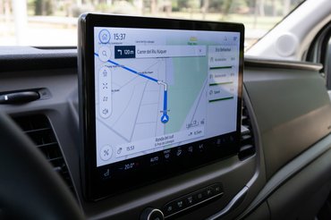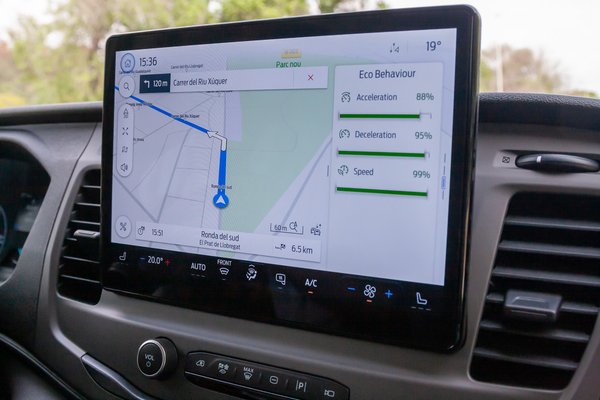 Az elmélet után következett a gyakorlat, végre elvihettük egy körre az E-Transitot. Belülre is jutott újdonság: a beltér ismerős, de sok ponton hozzányúltak, így például bekerült az új fedélzeti rendszert futtató, gigantikus központi kijelző. Az egész nagyon színes és szagos, a kijelző nem csak furgonhoz képest ad szép képet, de a rendszer nem keltett kész benyomást, sokszor döcögött. A régebbi rendszer viszont jól működött, így remélhetőleg ez javulni fog, mire eljut az autó a felhasználókhoz. A váltókar ezúttal egy tekerhető darab, ami sok Fordból lehet ismerős: ilyen van egy ideje például a Focusban és az Explorerben is.