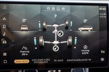 A nevében pedig ott a Rover, ami kötelez a terepes képességekre, és bár nekem nagyon vad a fantáziám, nincs az az élethelyzet, ahol el tudnám képzelni, hogy így pár buznyáknyira a 70 milliótól bárki is komolyan gondoljon egy olyan terepezést, ahol szükség lehet diffizárra. Márpedig van, a középső osztóműben és hátul is, a sok-sok kamera pedig főleg a szűkebb vájatokban segít elhelyezni az autót, utóbbi járda mellé parkolásnál is hasznos. Szintén van még gázlómélység-figyelő, ami kijelzőn mutatja, hogy meddig merülhetünk még, mielőtt vizet szívna a motor: ha felemeljük a kasznit a légrugókon, 900 milliméterig (persze itt nem mindegy az sem, milyen szögben érkeznénk a vízbe).