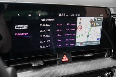 Egy szinttel feljebb a digitális klímapanel a megtestesült ambivalencia, máig nem tudom, hogy jó megoldás-e vagy sem: taktilis visszacsatolás híján muszáj odapillantani a használatához, cserébe viszont lehet váltani a klíma kezelőszervei és egy általános menüsor között, utóbbi már az infotainmentet irányítja. Ezzel együtt a két oldalsó tekerő funkciója is vált a hőmérséklet és a hangerő állítása között, simán bele is lehet futni, hogy melegebbet szeretnénk, de valamiért csak a Balázsék óbégatnak a szokásosnál is hangosabban - megszokást igényel. Ellentétben magával a középső, 12,3 colos kijelzővel és a menürendszerével, ami intuitív és gyors. Fogadni mernék, hogy lesz, akit zavarni fog a neonlila színvilág, de arra is, az indexeléssel együtt a műszeregységre vetített holttér-videó kárpótolja mindegyiküket.