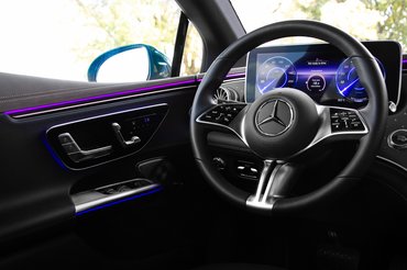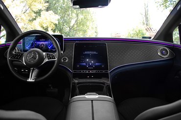 Érdekes, hogy az EQE-nek nincs dizájnja, már ha a dizájn alatt azt értjük, hogy a szemnek valami kellemes tárgy keletkezzen. Ezt a formát a szélcsatorna rajzolta, mindent a hatótávnak és a hatékonyságnak rendeltek alá. A szélvédő például olyan lapos, hogy a szenzorsziget miatt sokszor nem látszik a jelzőlámpa, szerencsére az autó felismeri, ha állunk a pirosnál, és élőképen mutatja nekünk középen a kereszteződést, nem kell hajolgatni. Viszont, ha már szenzorok: a vezetéssegítők baromi ügyesek, itt emelném ki a fényszóró azon funkcióját, ami éjszaka ábrákat rajzol az autónk elé a többi közlekedő tájékoztatására sávváltásnál, vagy a követési távolság csökkenésénél.